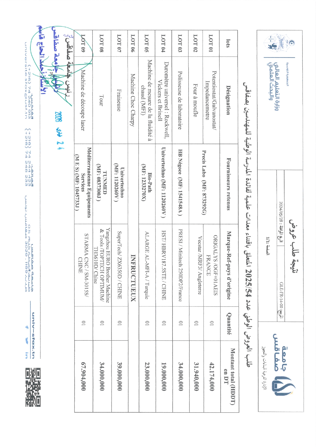 إعلان طلب عروض وطني عـــــدد2025/54 إقتناء معدات علمية لفائدة المدرسة الوطنية للمهندسين بصفاقس