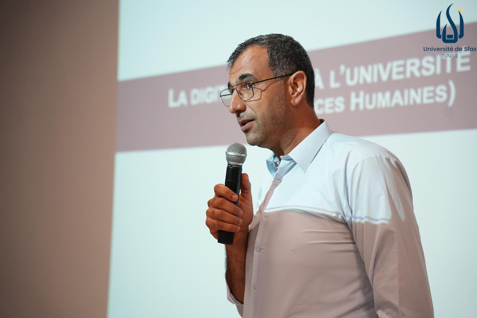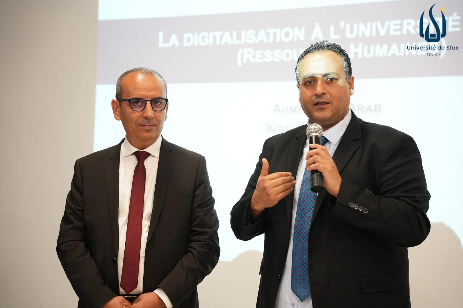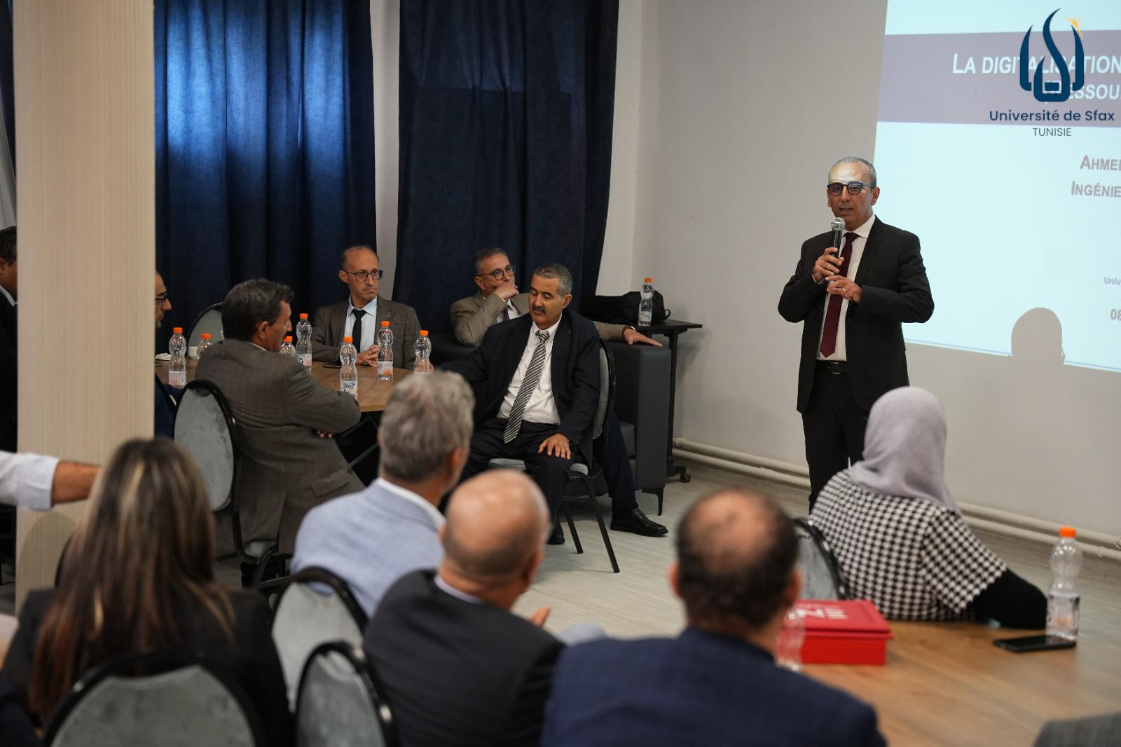 تقديم عرض حول تجربة جامعة صفاقس في رقمنة العديد من الخدمات من ضمنها الموارد البشرية والتصرف في الأطروحات وغيرها، من طرف السيد أحمد بن عرب مهندس عام مكلف بالإشراف على الإدارة الفرعية للدراسات والإستشراف والإعلامية،
