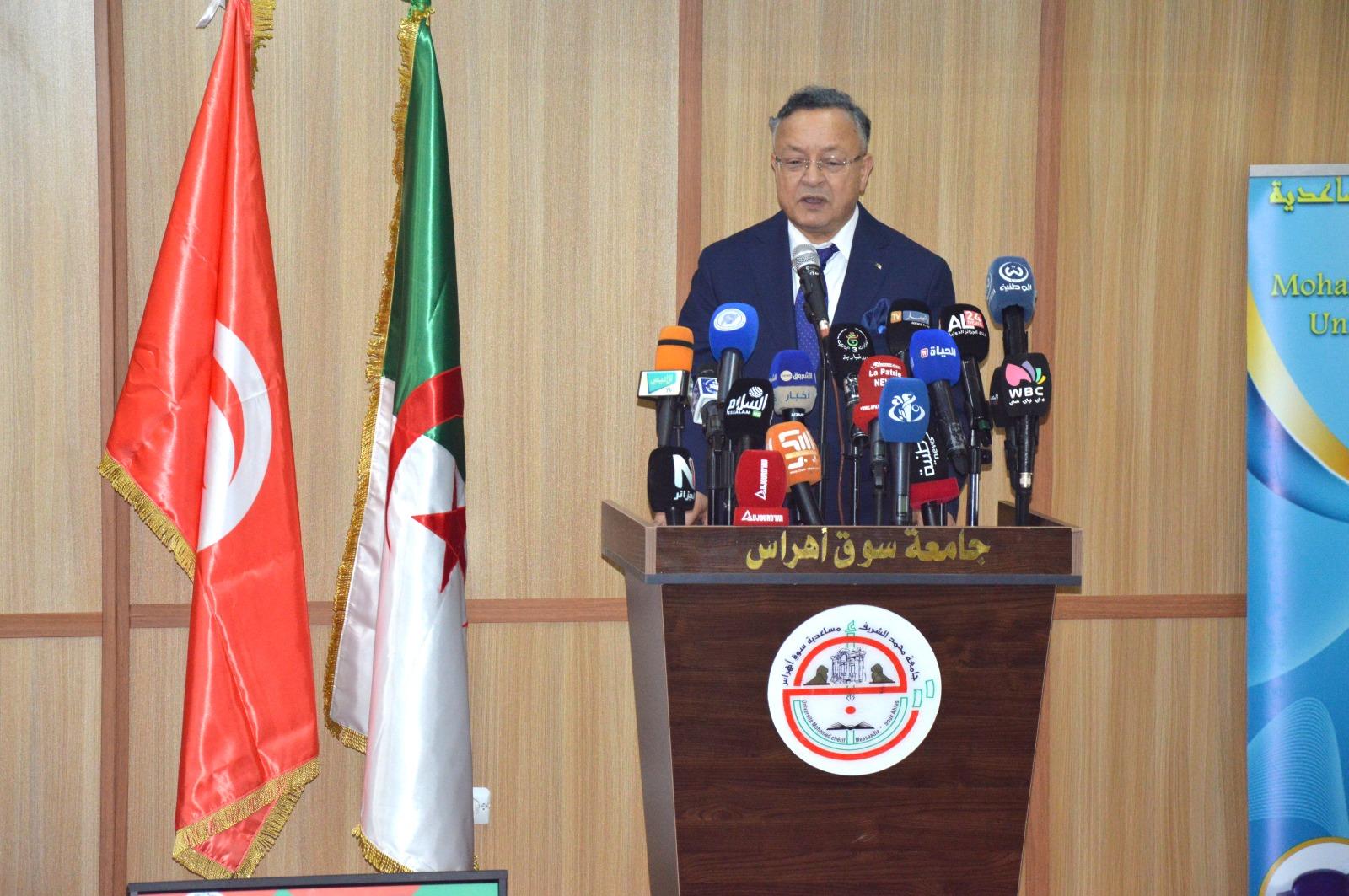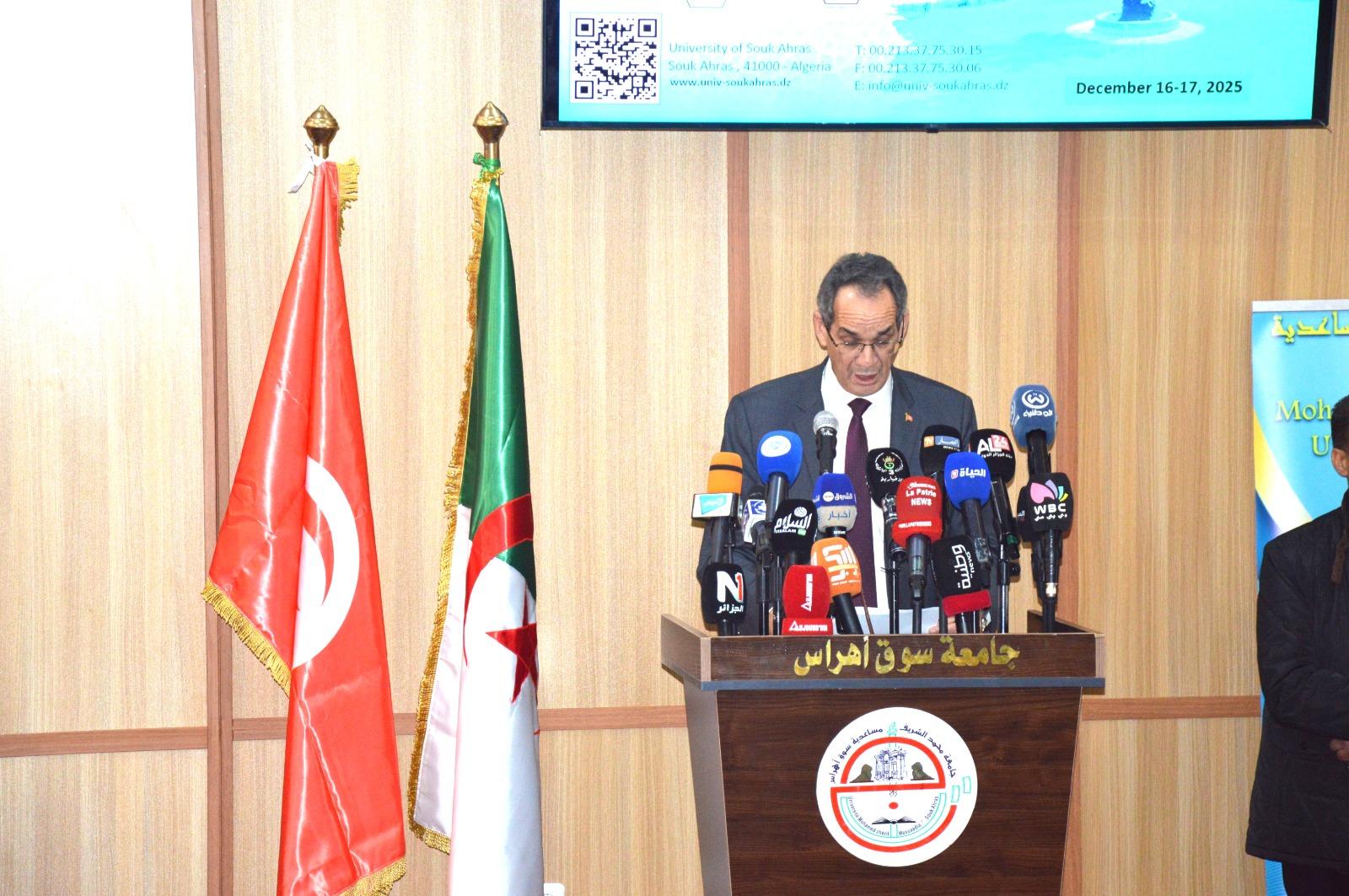 أشرف السيد منذر بلعيد وزير التعليم العالي والبحث العلمي مع نظيره بالجمهورية الجزائرية الديمقراطية الشعبية السيد كمال البداري يوم الثلاثاء 16 ديسمبر 2025، على أشغال الملتقى السابع للجامعات التونسية الجزائرية الحدودية الذي انتظم بجامعة الشهيد محمد شريف مساعديه بسوق أهراس تحت شعار: "التعليم العالي في العصر الرقمي: المعرفة والابتكار والقدرات التنافسية الاقتصادية"،