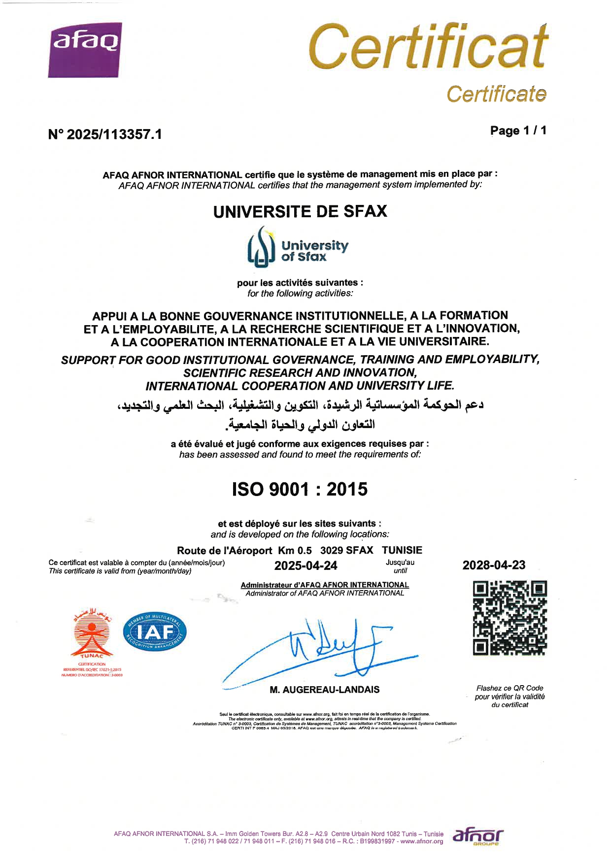 Voir le certificat ISO 9001:2015 de l’Université de Sfax